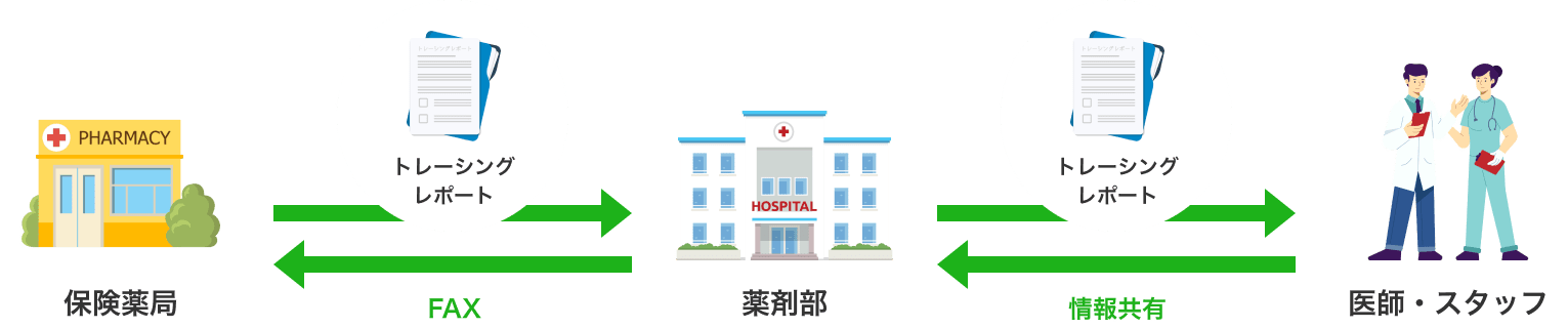 お送りいただいたトレーシングレポートは、薬剤部化学療法担当者を中心に、主治医を始め院内スタッフへ情報共有するとともに、保険薬局へ受理内容をフィードバックする体制を整えております。