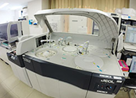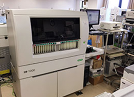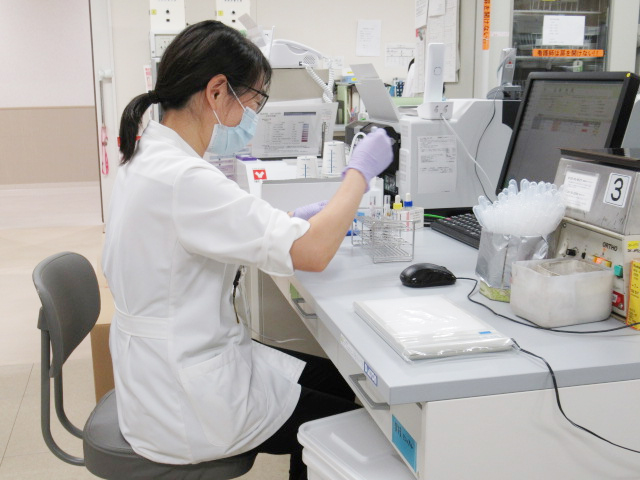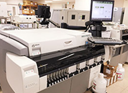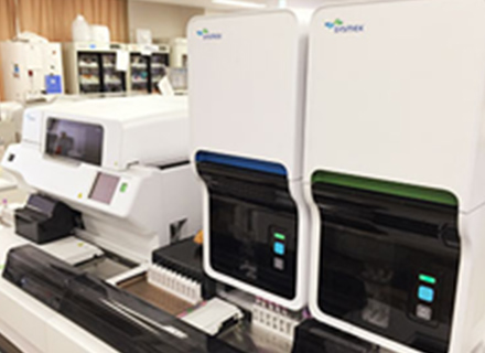生化・免疫検査室では、血清や体液などの検体の分析をはじめ、外注検査や血液ガス、B型肝炎、C型肝炎の抗原・抗体検査、梅毒、HIVを初めとする感染症、甲状腺機能検査、腫瘍マーカーなどの検査を行っています。24時間いつでも迅速で良質の検査が受けられる体制で稼働しています。