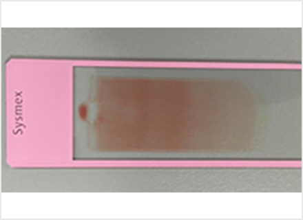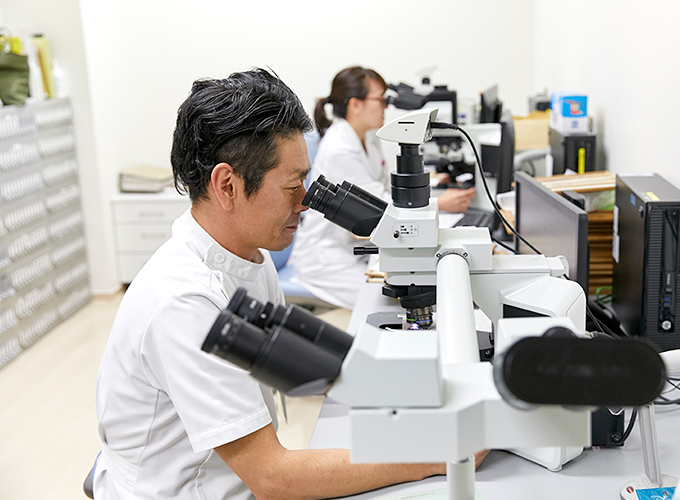材料をスライドガラスへ塗抹します。塗抹標本を作成し、染色して顕微鏡で観察します。