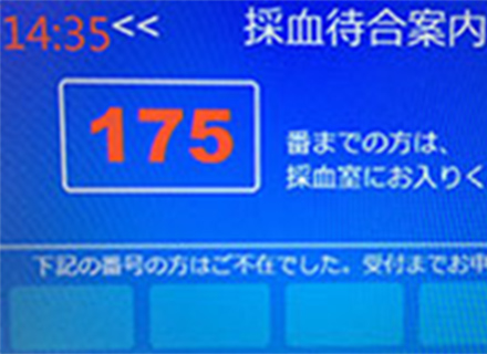 - 採血のある方は、掲示板に受付番号が点灯したら入室してください。
