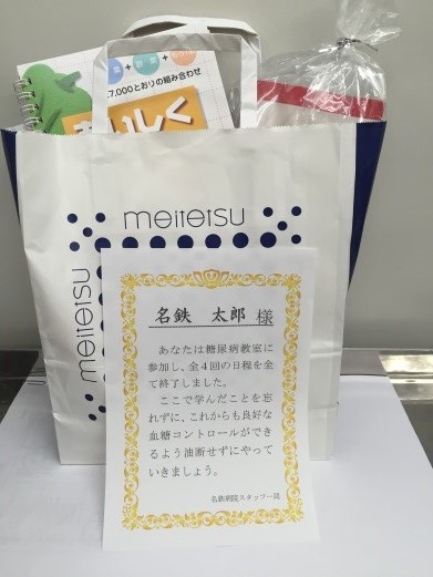 医師・管理栄養士をはじめとする医療スタッフがそれぞれの専門的立場からお話しさせていただき、皆さんからの疑問・質問にもお答えいたします。また管理栄養士からの食事のお話は毎回季節や旬に合わせて変わりますので必見です。平成29年5月から基本編・応用編に分けて開催しております。基本編に関しては、糖尿病と初めて言われた方向けの講義形式の教室になっており、月1回、4回で1クールとなっています。4回出席された方には賞状と粗品を進呈しています。応用編に関しては、より糖尿病に関する知識を深めるためになるべく参加型の教室を目指しております。月1回、6回で1クールですが、興味のある回だけの参加も可能です。基本編では、当院独自のテキストを使用して各スタッフがお話していますが、購入されない場合は当日のみの貸し出しもしております。また教室に参加できない方でもテキストのみ購入することは可能です。内科外来でお申し出ください。