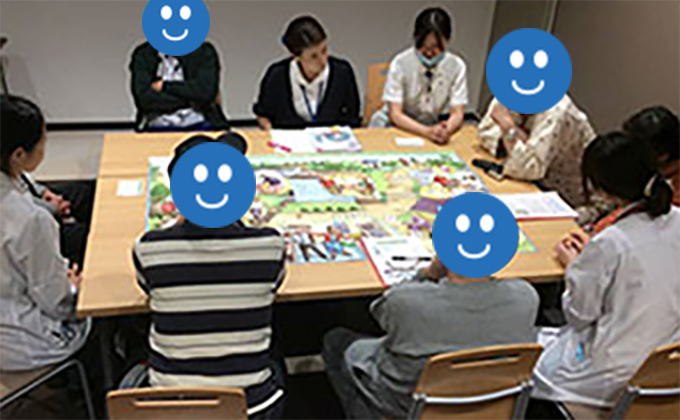 通常の教室は講義形式ですが、当院ではスゴロクのような「会話のための地図」【カンバセーションマップ】を用いた対話型の糖尿病教室を行っております。糖尿病のことを皆で語り合うことでまた新たな気づきが生まれ、自分一人ではないとわかって安心したなどの意見が多く聞かれます。糖尿病教室応用編の中でマップを使用した回を設けております。