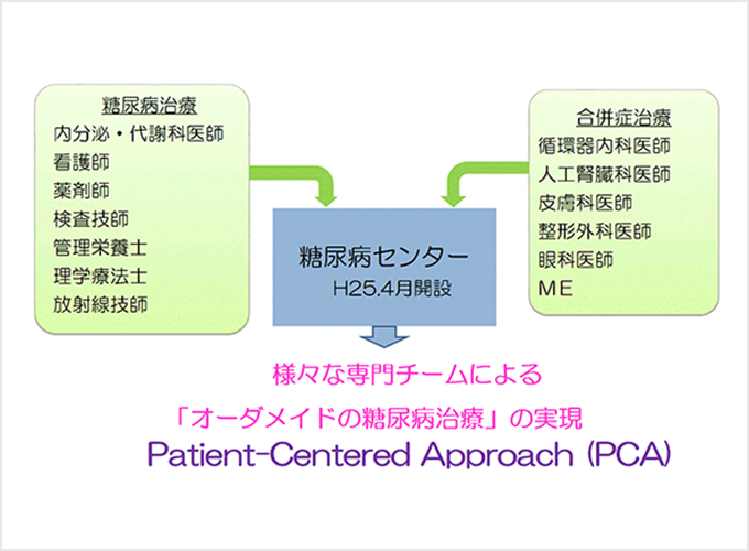 そこで、当院では平成25年4月1日に糖尿病センターを開設し、医師だけでなく様々な職種からなる専門チームが診療にあたることにより相乗効果を生み、治療の個別化を実現するべく努力しています。患者さんの生活・社会背景を考慮し患者さんとの信頼関係を深めながら診療に当たり、患者さん一人ひとりに合わせた、より良い治療
