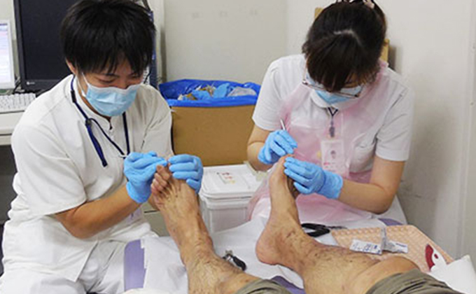 足のトラブルに対し、看護師がアセスメントとケア(予防的処置)を行います。