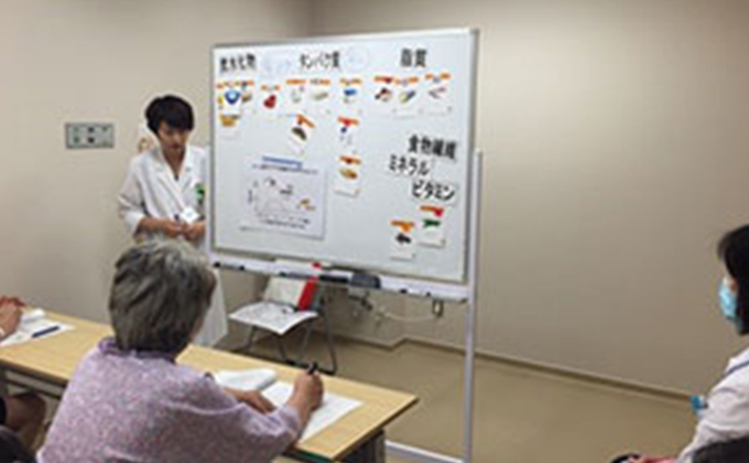 糖尿病の合併症の一つである糖尿病性腎症の進行を防ぐための指導を行う外来です。腎症の進行を防ぐには、血糖コントロールだけでなく、血圧コントロールおよび食事療法が非常に重要になります。現在、透析導入になる原因疾患の1位は糖尿病性腎症であり、腎症が進行していると脳梗塞や心筋梗塞・狭心症といった動脈硬化性疾患も多くなることがわかっています。そこで、この外来では糖尿病専門医と糖尿病療養指導士の資格をもつ看護師・管理栄養士が連携して食事および生活の指導にあたっています。生活習慣や食事での塩分摂取量などを評価し、イラストを用いた独自のパンフレットを用いて、患者さんにあった指導を行っています。平成25年4月1日より開設し、現在では年間200人以上の患者さんを対象に、毎月約100件の指導を行っています。