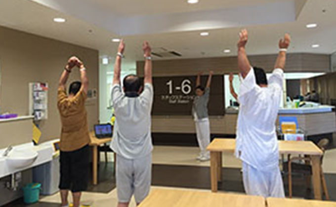 また、運動療法として、昼食後に病棟内でラジオ体操を行い、その後、可能な方には歩数計を貸し出し、院内ウオーキングに行っていただいています。歩数を確認するとともに、運動の前後で血糖測定を行っています。運動することで実際に血糖が下がることが体感できるため、モチベーションの向上につながっています。