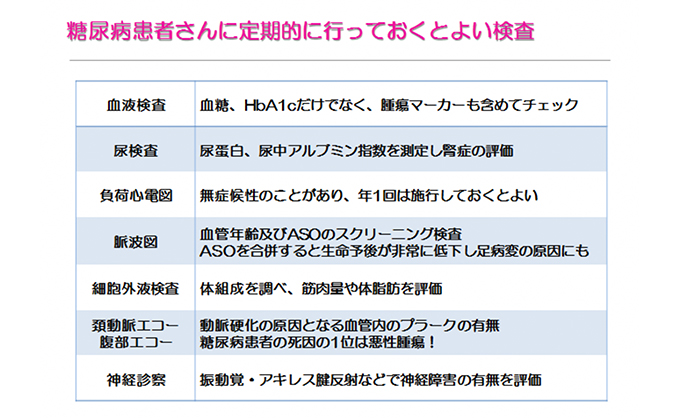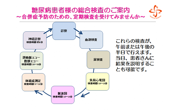 また、糖尿病は細小血管障害・動脈硬化といった血管合併症だけでなく悪性腫瘍の罹患率も高いことがわかっています。当院では外来及び入院患者に対して動脈硬化の早期発見・早期治療のために頸動脈エコー・脈波図・負荷心電図などを積極的に行っています。そこで、地域の診療所に通院されている患者さんに対しても、血管合併症と悪性腫瘍のスクリーニングを兼ねた検査を一括して行いその場で結果説明ができるようにしたいと考えています。具体的には腫瘍マーカーを含めた血液検査、尿検査、脈波図、負荷心電図、頚動脈エコー、腹部エコー、神経診察、眼科受診などを半日で行い、その日に患者さんに結果説明をさせていただき、またその結果をかかりつけ医に情報提供させていただきます。簡略化した申込書のみで受診していただき、情報のやり取りをしていくことで将来的に地域との循環型パスの作成を目指しています。