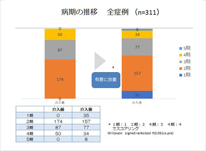 平成28年12月までに指導した311名について解析すると、指導前後でHbA1cは7.1±0.98%から7.0±1.11%、収縮期血圧は147.5±19.9mmHgから138.2±14.3mmHgと有意に改善し、約25%の患者で腎症の病期の改善を認めました。