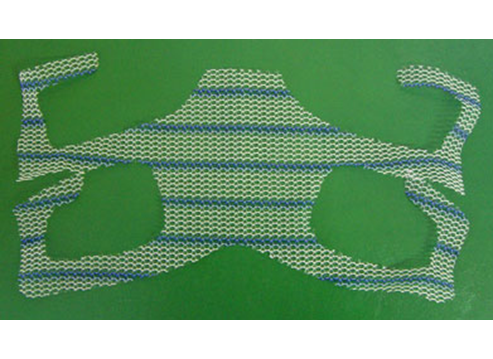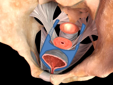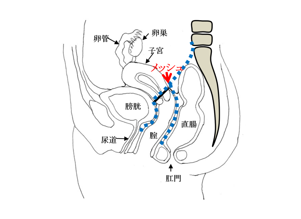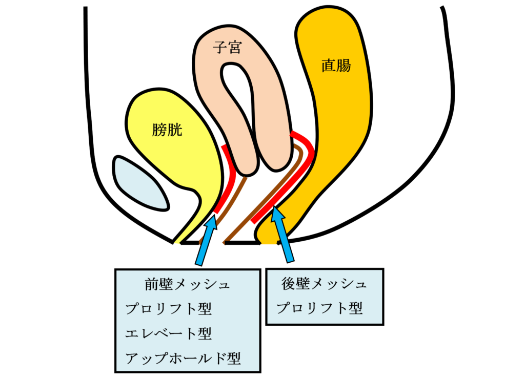 手術用の糸と同じ材質の身体になじみやすい素材のポロプロピレン糸を編んだメッシュを下の図のように、膀胱と前腟壁の間(前壁メッシュ:A-TVM)と直腸と後腟壁の間(後壁メッシュ:P-TVM)に腟壁を切開して埋め込む手術(経腟手術)です。膀胱瘤の場合は前壁メッシュだけ、直腸瘤の場合は後壁メッシュだけ埋め込みますが、子宮脱や腟断端脱の場合は前壁メッシュと後壁メッシュ両方を埋め込みます。比較的大きなメッシュを埋め込む手術で、プロリフト型TVM手術といいます。それに対して比較的小さなメッシュを埋め込んで骨盤臓器脱を治す手術方法のエレベート型TVM手術を平成25年11月に導入し、平成26年9月までに166例施行しました。エレベート型TVM手術は、子宮脱に対しても前壁メッシュだけで治療できるため手術時間が短縮しました。さらに、平成26年9月からは、エレベート型 TVM 手術に代わってアップホールド型TVM手術を導入しました。アップホールド型TVM手術は、エレベート型のTVM手術に比較してさらに短時間で行える身体に負担の少ない手術です。令和5年3月までに370例施行しましたが、プロリフト型TVM手術やエレベート型TVM手術に比べて術後疼痛が少なく合併症が少ない素晴らしい手術です。