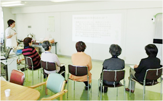 内容は、まずウロギネセンターの看護師が骨盤の構造や生理、効果ある疾患とそれらのさまざまな治療方法を約10分間スライドで説明します。次に、理学療法士が実際の指導を行います。最後に座談会形式で理学療法士と看護師がご質問やお悩みの相談を受けます。個別に相談ご希望の方は個別にも相談をお受けします。平成27年6月からは初級・中級・上級コースの3コースを設け、平成29年11月からは継続コースを増設しました。1グループ5~7名で行い45分のコースです。指導時間は、第3土曜日が9:00~9:45、10:00~10:45、11:00~11:45、第1月曜日が11:00~11:45です。参加方法は、名鉄病院泌尿器科・ウロギネセンターに受診され骨盤臓器脱・腹圧性尿失禁・過活動膀胱と診断されるか、それらの疾患の予防が必要と診断された方を対象に予約制で行っています。当科受診歴のある方は電話予約(0570-023100(ナビダイヤル)泌尿器科または女性泌尿器科・ウロギネセンター)もお受けします。また、平成27年6月から骨盤底筋体操個人指導外来を開設しました。毎週木曜日14:00~17:00に市川美代子皮膚排泄ケア認定看護師が、平成28年8月から毎週火曜日13:00~17:00に名古屋大学大学院医学系研究科リハビリテーション療法学専攻理学療法学講座助教の井上倫恵先生が、平成29年5月から毎週水曜日13:00~17:00に骨盤底筋体操専門理学療法士の渡邊日香里先生が、予約制で行っています。1人1回30分の指導で、腟圧計を使って骨盤底筋の収縮度を計測して正しい体操が行えているか評価して指導しています。グループ指導の骨盤底筋体操教室と組み合わせて行うことで、より効果的な骨盤底筋体操を習得・実施することができます。