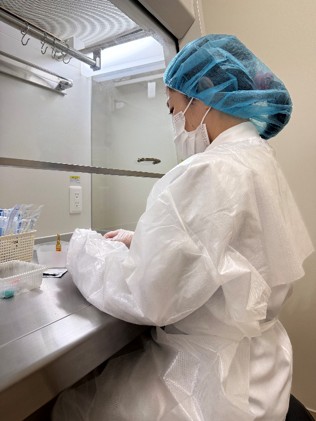 医療のニーズに対応するため、市販化されていない製剤(軟膏・ネブライザー等)を調製しています。NST(栄養サポートチーム)担当薬剤師が処方提案したTPN(高カロリー)輸液や、一部外来患者さんの注射薬をクリーンベンチ内で無菌調製します。