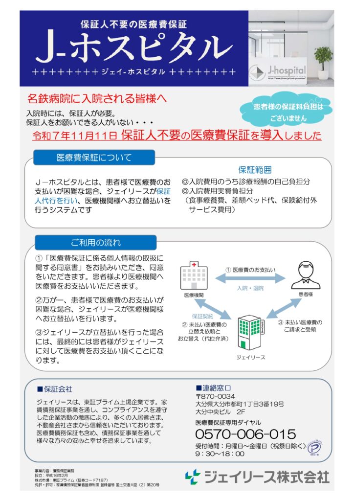 当院では、11月11日(火)以降に入院受付を行う患者さんより、保証人不要の保証人代行サービス(J-ホスピタル)を導入いたします。これに伴い、入院時に保証人を選定いただくことが不要となります。なお、患者さんの保証料負担はございません。