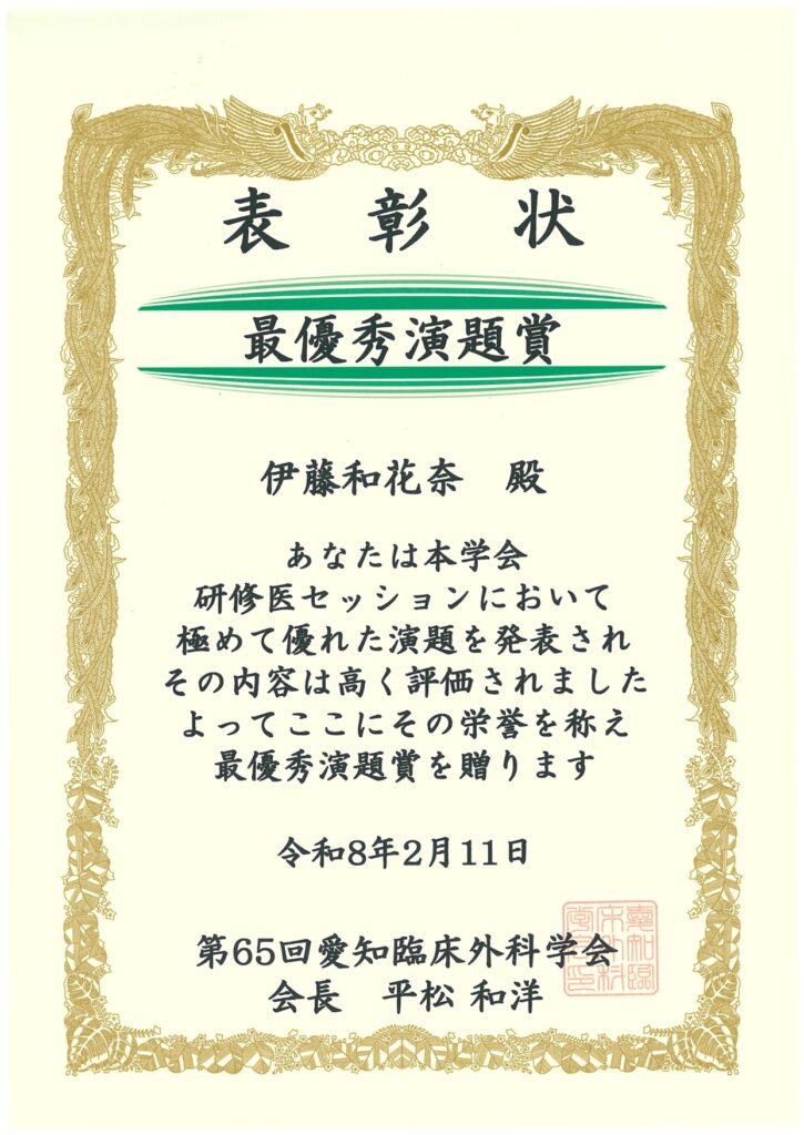 伊藤和花奈先生が第65回愛知臨床外科学会研修医セッションにおいて最優秀演題賞を受賞しました。